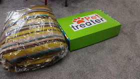 The shipping box was extra big this month because of the bonus doggie bed! Here it is all wrapped up beside the very snazzy PetTreater box. I like the bright colors of the box.